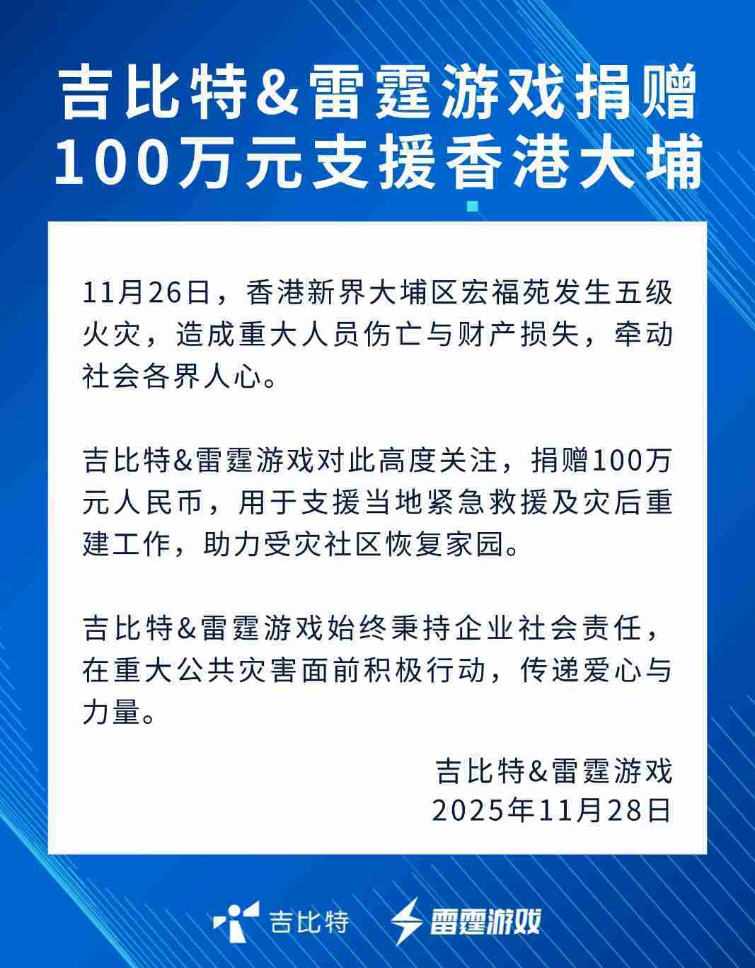 公司新闻 一竞技&雷霆游戏捐赠100万元 支援香港大埔火灾救援及灾后重建