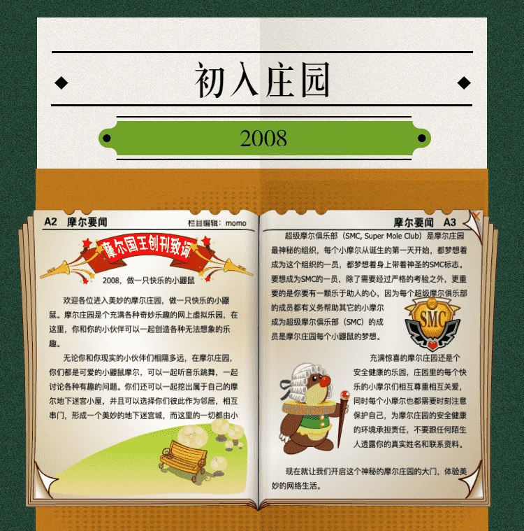 在这一年,,,,摩尔庄园诞生了。。。。在这里,,,,大家都是可爱的红鼻子鼹鼠小摩尔,,,,可以一起勤劳耕作,,一起高山滑雪......我们都是摩尔庄园的建设者。。。。